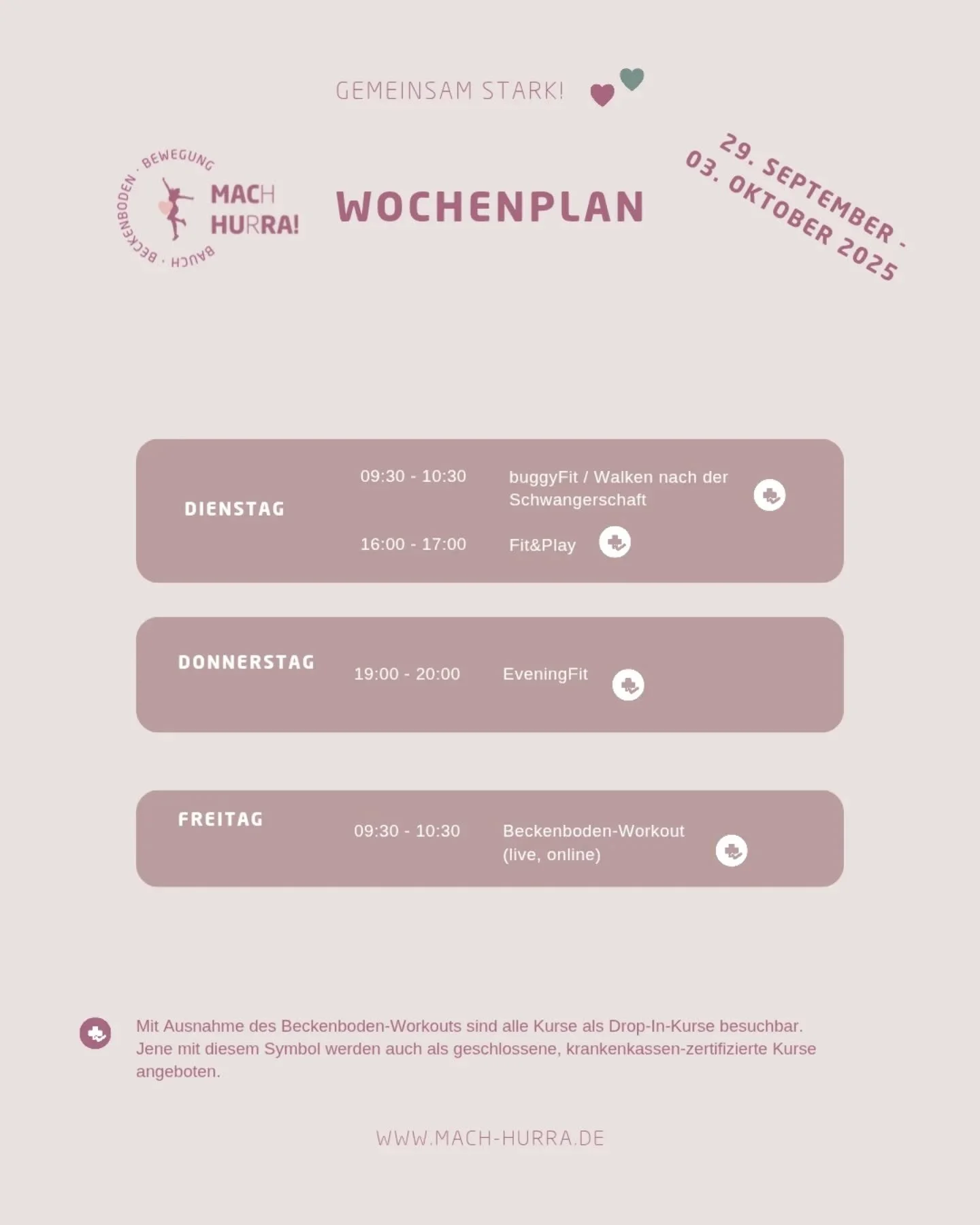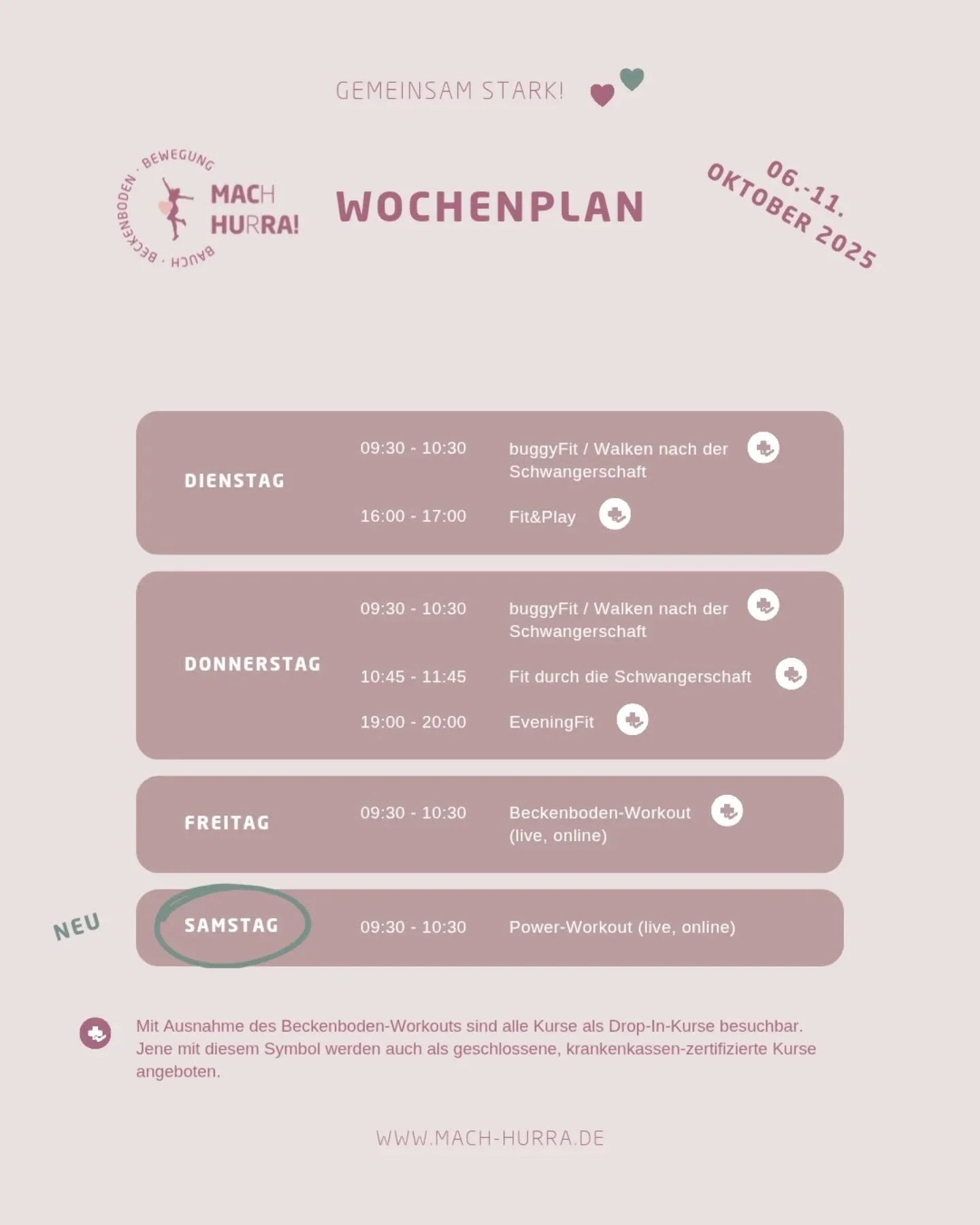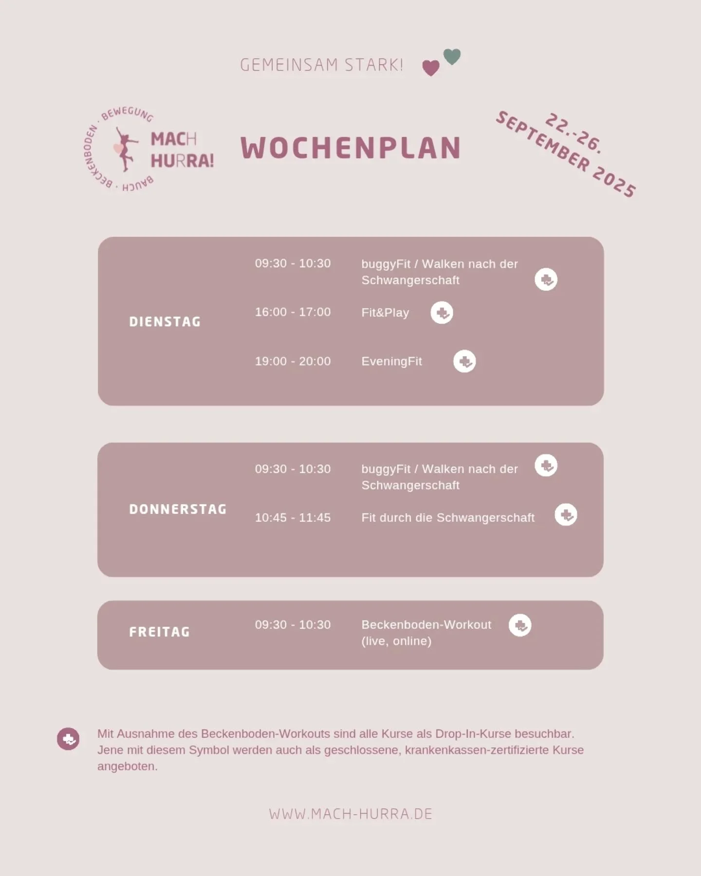 Egal, ob mit Babybauch, nach der Geburt oder als Nicht-Mama - wir haben den idealen Fitnesskurs für dich und deine Bedürfnisse. Mach mit. MACH HURRA!